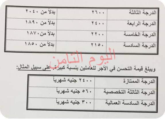 وذكر البيان ان قيمة التحسن في الاجر للعاملين بالدولة يبلغ علي سبيل المثال في الدرجة الممتازة 2400 جنيها شهريا، والثالثة التخصصية 560 جنيها شهريا والسادسة العمالية 300 جنيها شهريا.