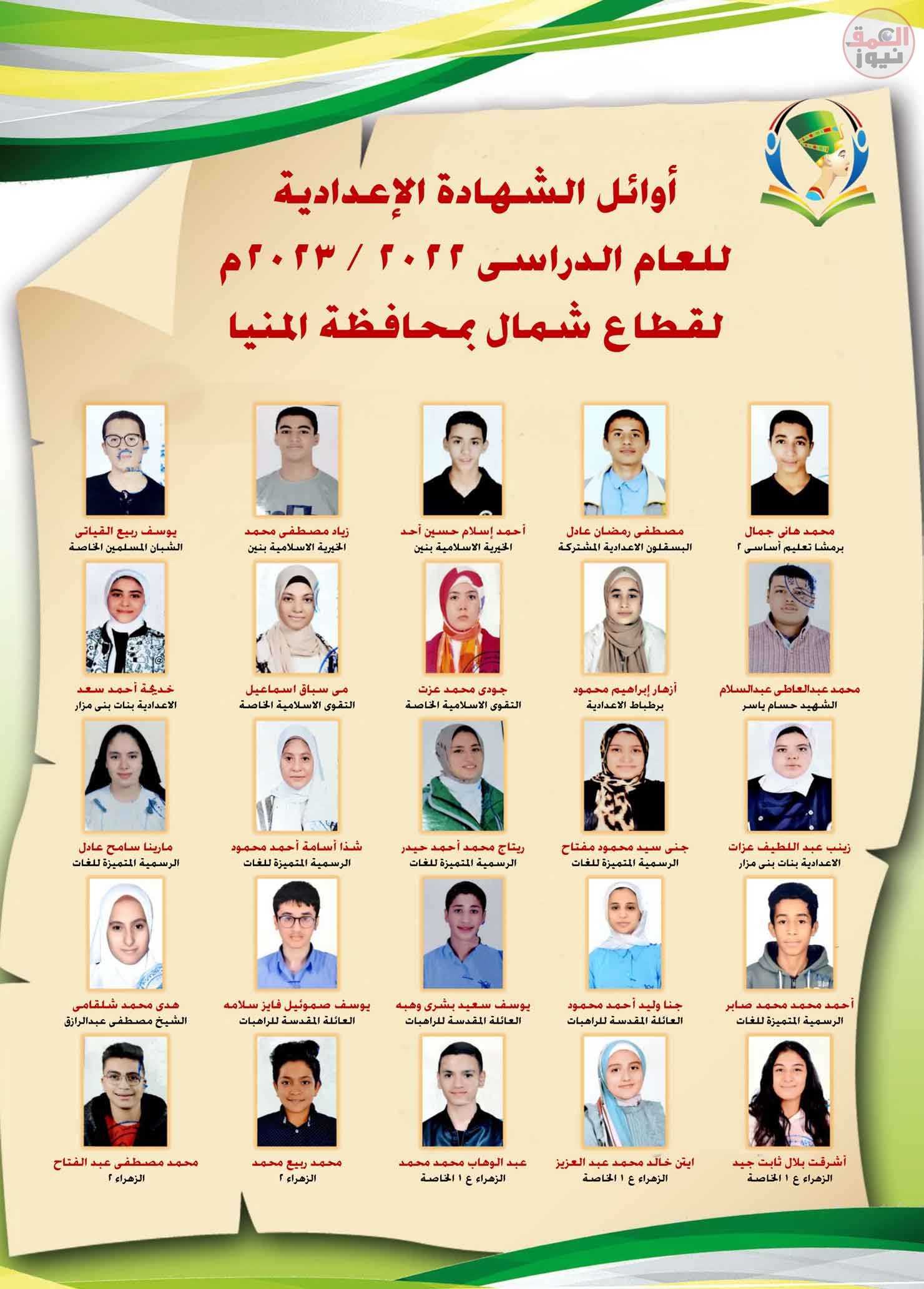 مريم ياسر محمد فرغلي المنيا الرسمية الإعداديه للغات، مى عماد علي فهمى القومية الإعدادية للغات، سامر سيمون عادل عياد الآباء اليسوعيين الخاصة، نعمة طارق محمود محمد كفرالمنصورة الرسمية للغات، محمد عادل يوسف أحمد تلة الإعدادية بنين، منة الله محمد أحمد النوادى الرسمية للغات، شهد إبراهيم محمود كفر المنصورة الرسمية للغات، إيرينى كيرلس أديب وهبة نزلة عبيد الإعدادية، أمنية وحيد سيف النصر المنيا الإعدادية الثانوية الجديدة بنات، محمد حازم طه حسن المنار الإسلامية الخاصة.